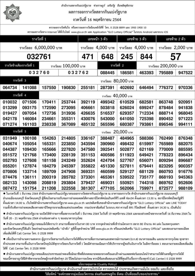 ผลสลากกินแบ่งรัฐบาลงวดประจำวันที่ 16 พฤศจิกายน 2564 ตรวจสลากกินแบ่งรัฐบาล ผลหวย เช็คสลากกรอกตัวเลข ใบตรวจหวย พร้อมสถิติหวยย้อนหลัง ตรวจหวยเร็วๆ ทันใจ