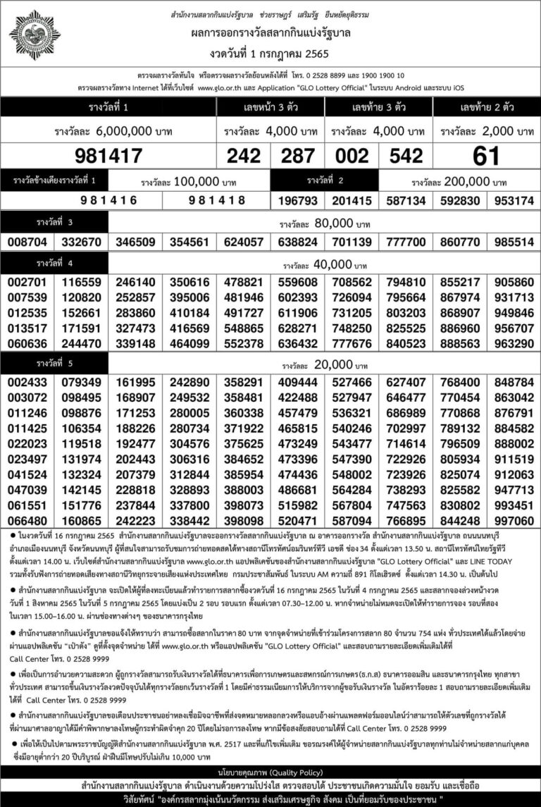 หมายเหตุ : โปรดตรวจสอบความถูกต้องกับสำนักงานสลากกินแบ่งรัฐบาลอีกครั้ง