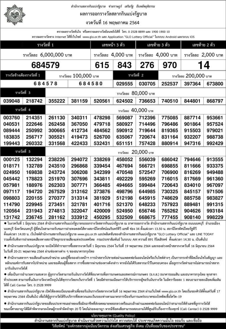 ผลสลากกินแบ่งรัฐบาล ตรวจหวย งวดประจำวันที่ 16 พฤษภาคม 64 ตรวจสลากกินแบ่งรัฐบาลผลหวย เช็คสลากกรอกตัวเลข ใบตรวจหวย พร้อมสถิติหวยย้อนหลัง ตรวจหวยเร็วๆ ทันใจ