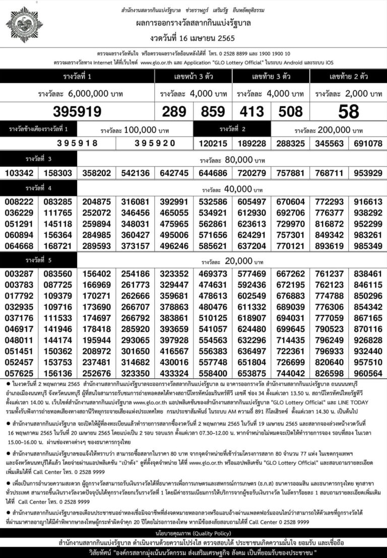 ผลสลากกินแบ่งรัฐบาลงวดประจำวันที่ 16 เมษยน 2565 ตรวจสลากกินแบ่งรัฐบาล ผลหวย เช็คสลากกรอกตัวเลข ใบตรวจหวย พร้อมสถิติหวยย้อนหลัง ตรวจหวยเร็วๆ ทันใจ