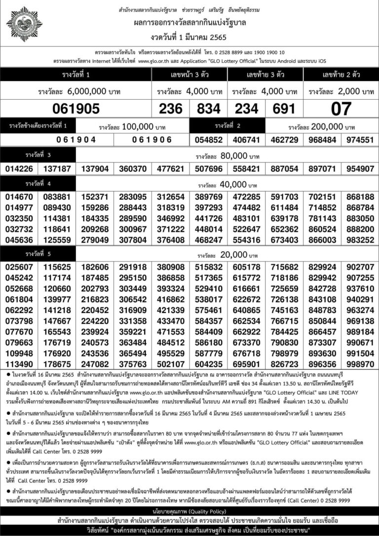 ผลสลากกินแบ่งรัฐบาลงวดประจำวันที่ 1 มีนาคม 2565 ตรวจสลากกินแบ่งรัฐบาล ผลหวย เช็คสลากกรอกตัวเลข ใบตรวจหวย พร้อมสถิติหวยย้อนหลัง ตรวจหวยเร็วๆ ทันใจ
