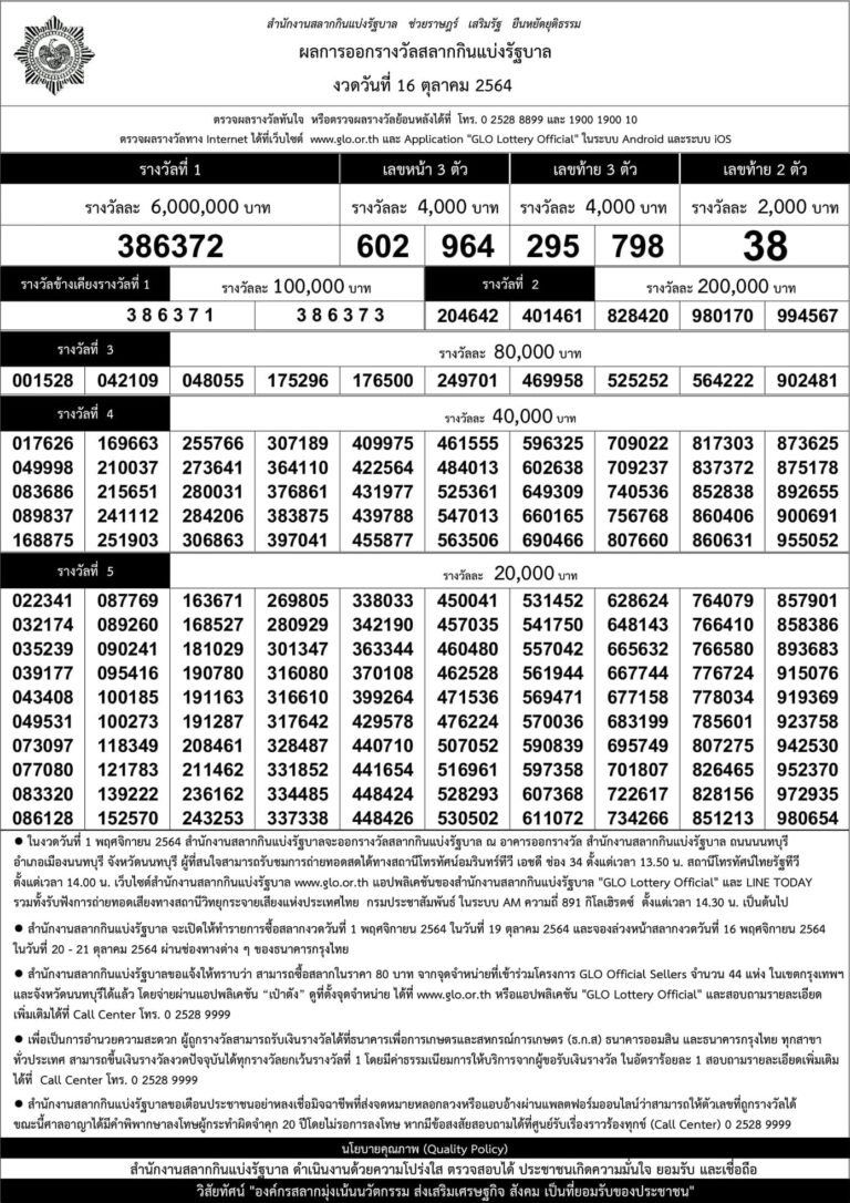 ผลสลากกินแบ่งรัฐบาลงวดประจำวันที่ 16 ตุลาคม 2564 ตรวจสลากกินแบ่งรัฐบาล ผลหวย เช็คสลากกรอกตัวเลข ใบตรวจหวย พร้อมสถิติหวยย้อนหลัง ตรวจหวยเร็วๆ ทันใจ