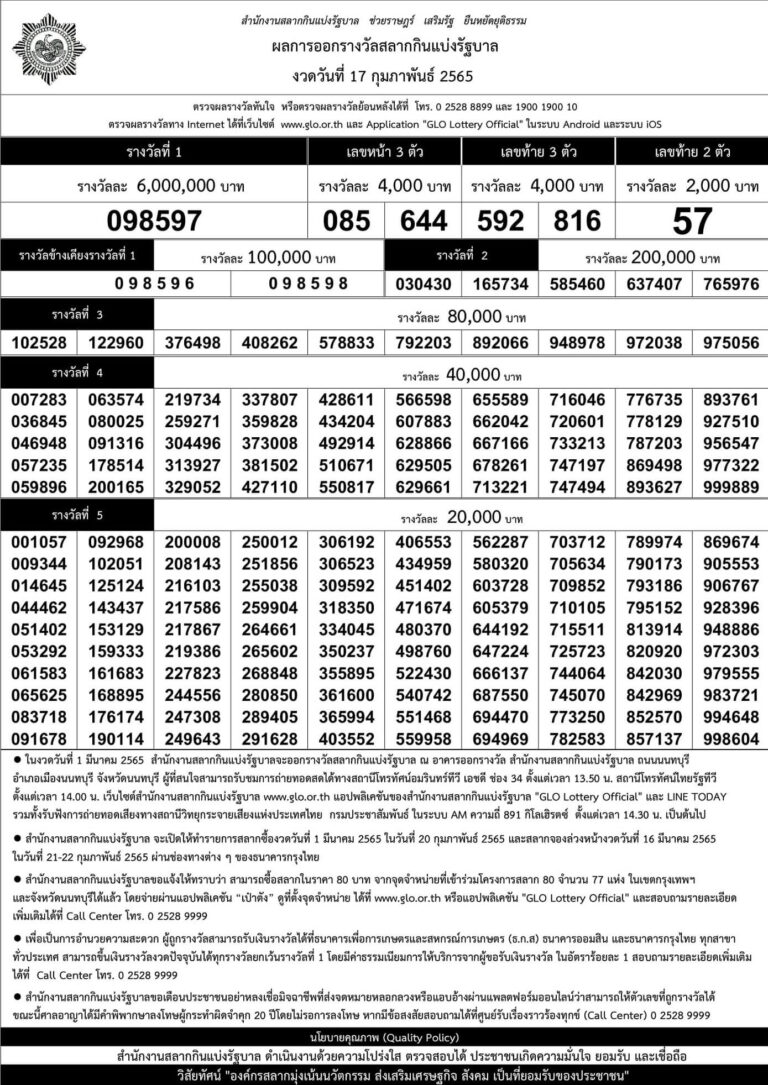 ผลสลากกินแบ่งรัฐบาลงวดประจำวันที่ 17 กุมภาพันธ์ 2565 ตรวจสลากกินแบ่งรัฐบาลผลหวย เช็คสลากกรอกตัวเลข ใบตรวจหวย พร้อมสถิติหวยย้อนหลัง ตรวจหวยเร็วๆ ทันใจ